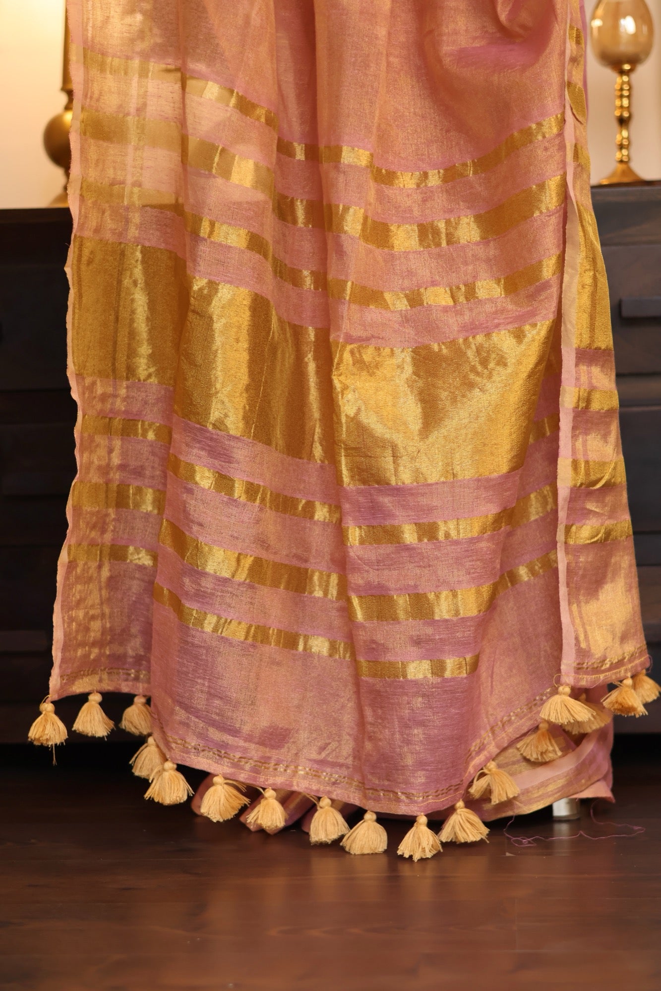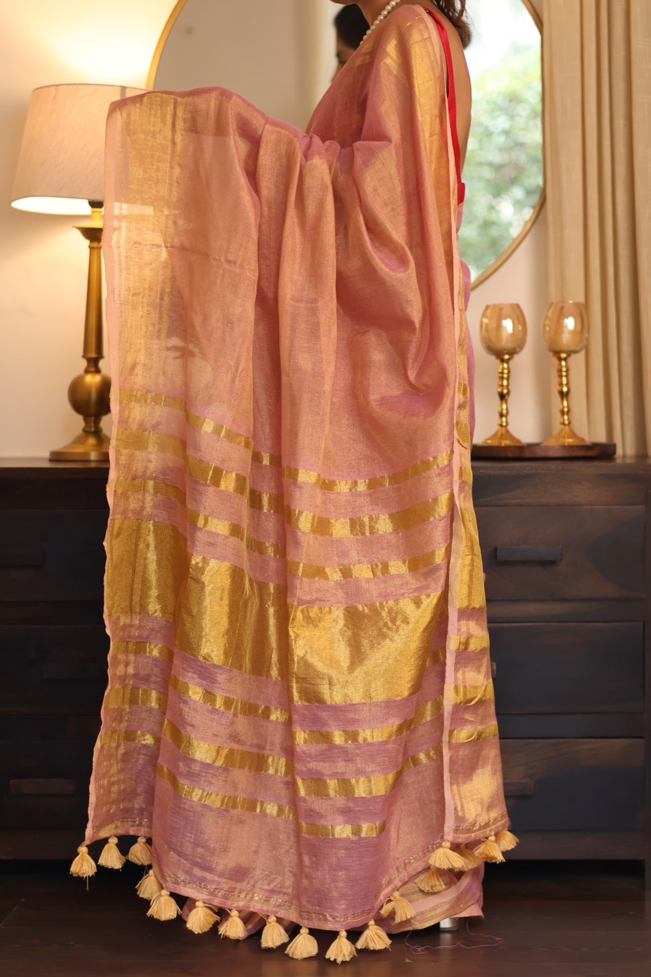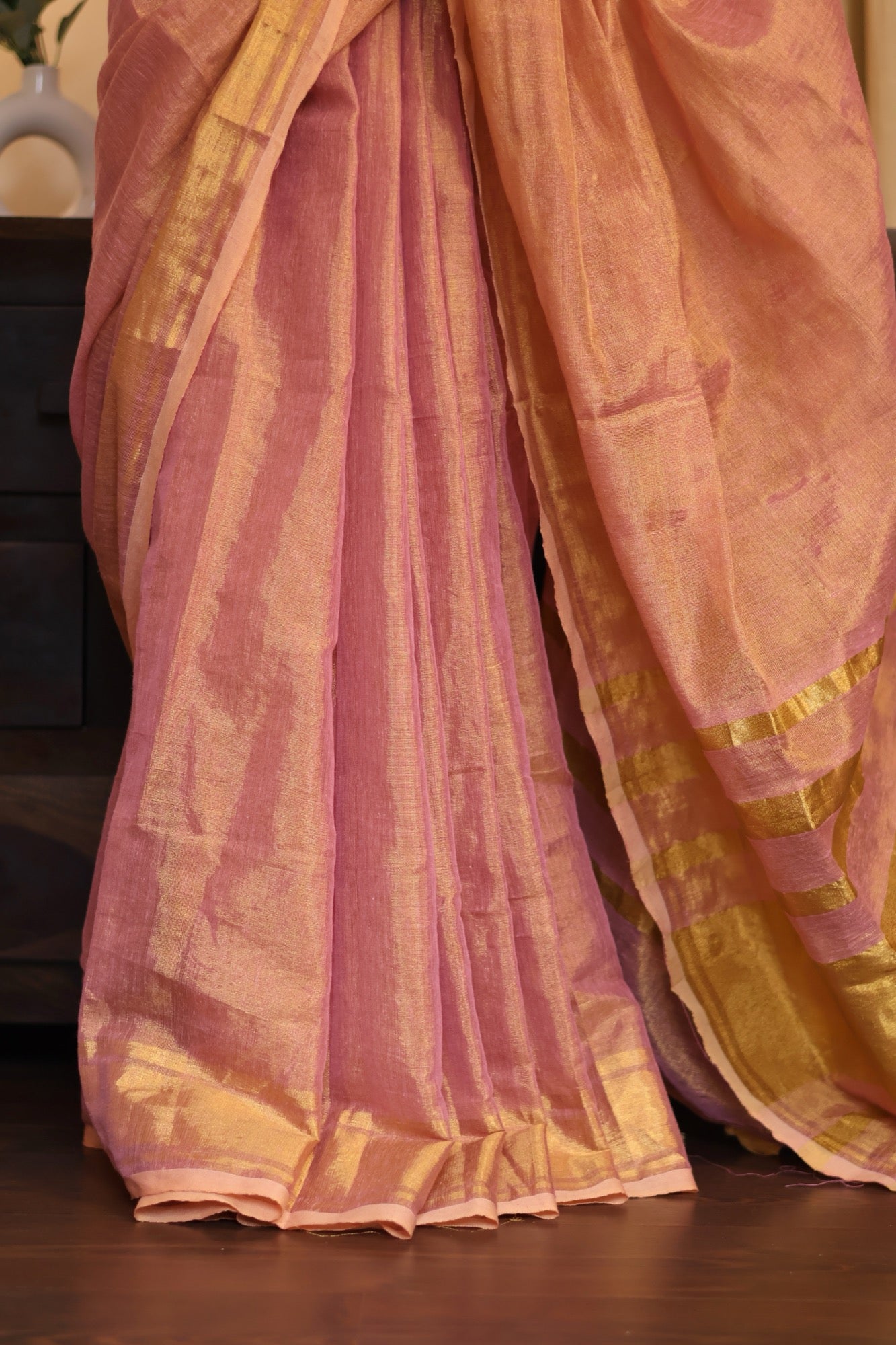 A blush-pink tissue linen kissed with warm gold tones, Rani moves gently with every step. Light, breathable, and finished with a subtle zari border, it’s the kind of saree you reach for when the occasion is special but the mood is effortless — from intimate wedding functions to festive evenings at home.