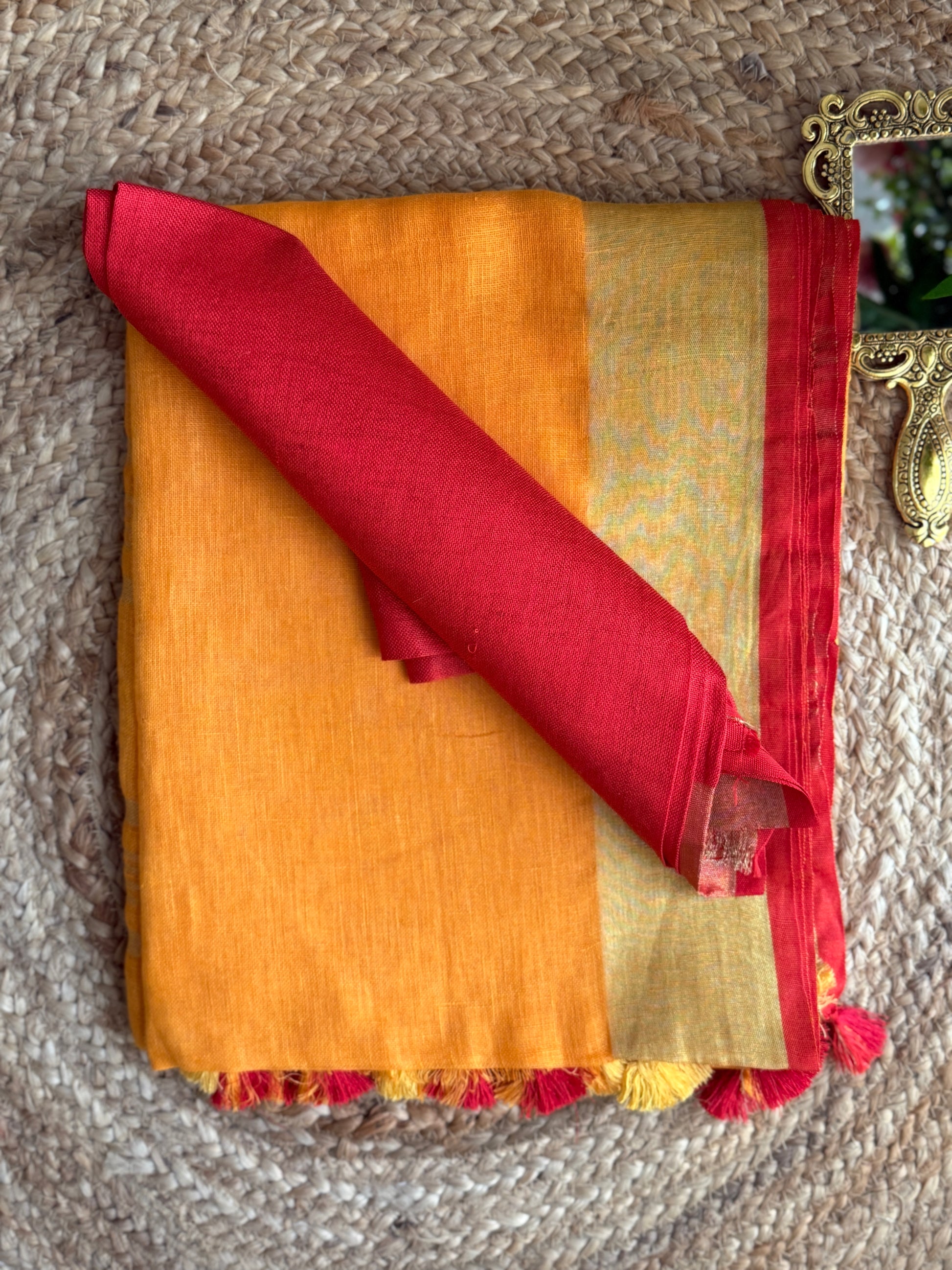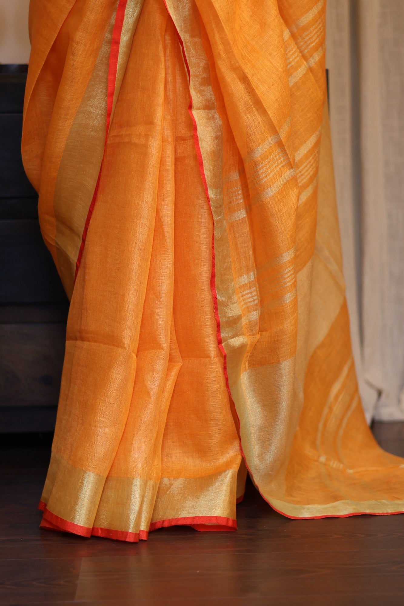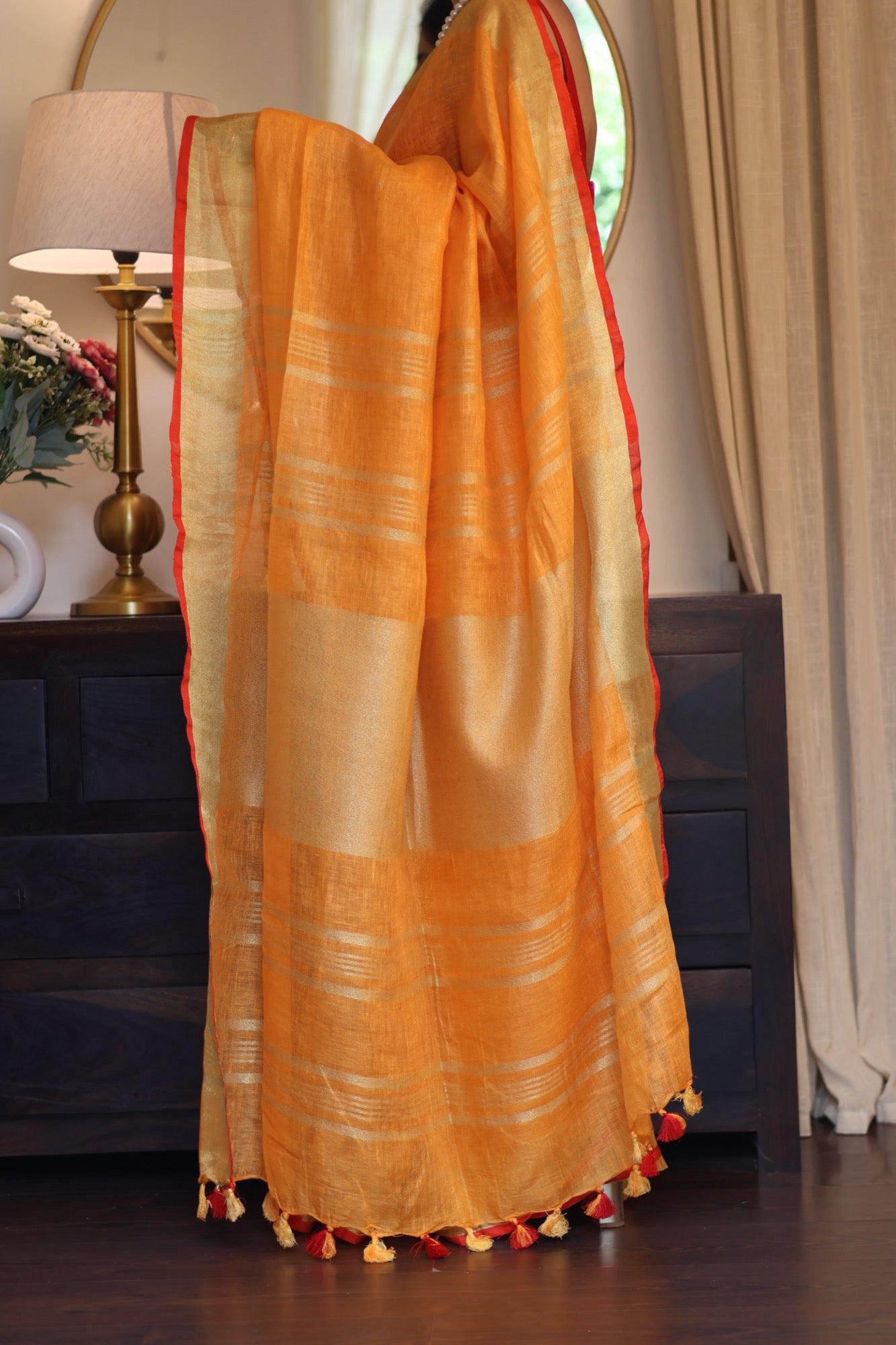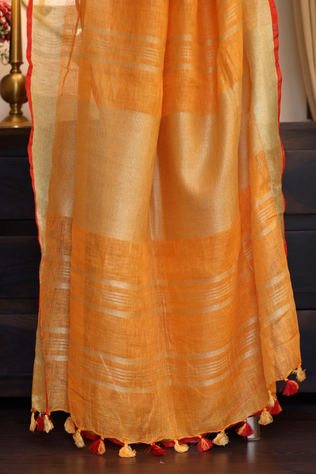 Colour: Vibrant amber-orange with zari stripes and red edging