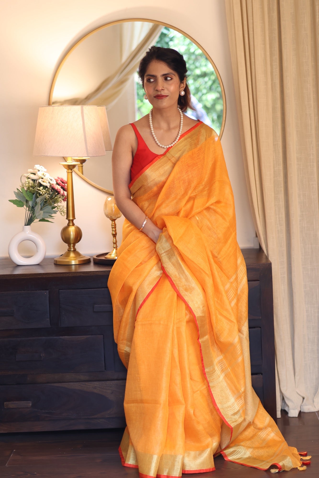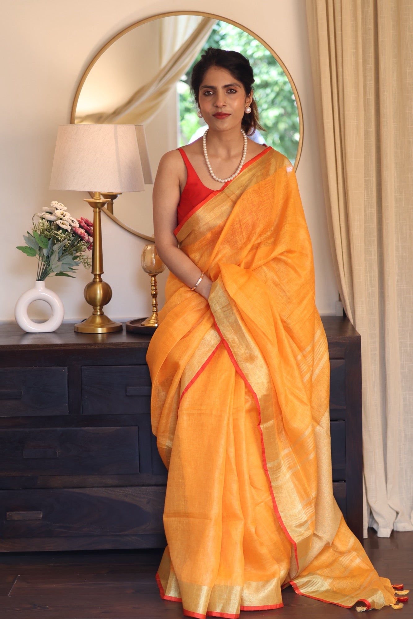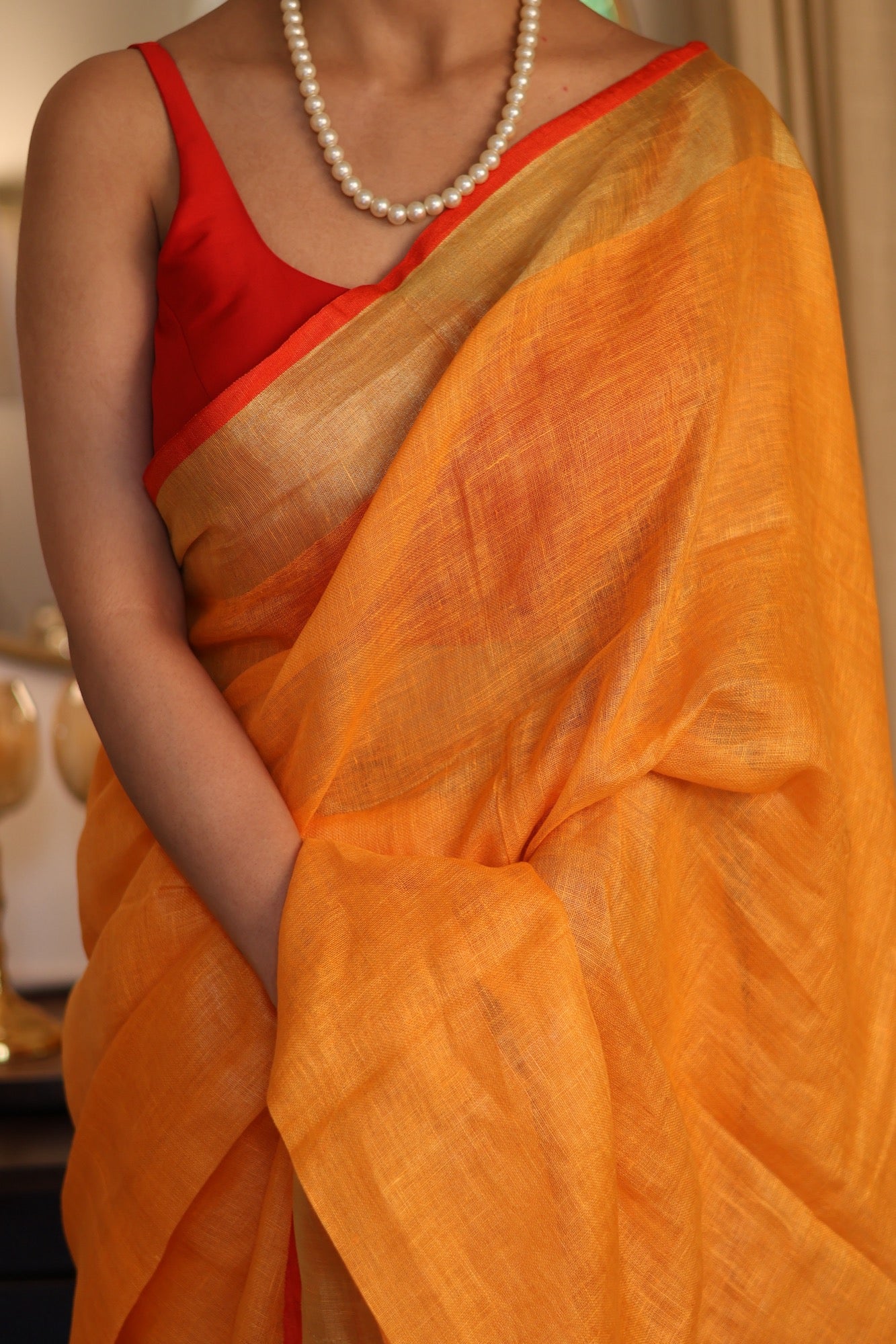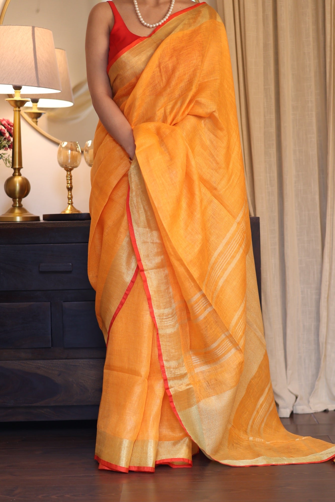 Colour: Vibrant amber-orange with zari stripes and red edging