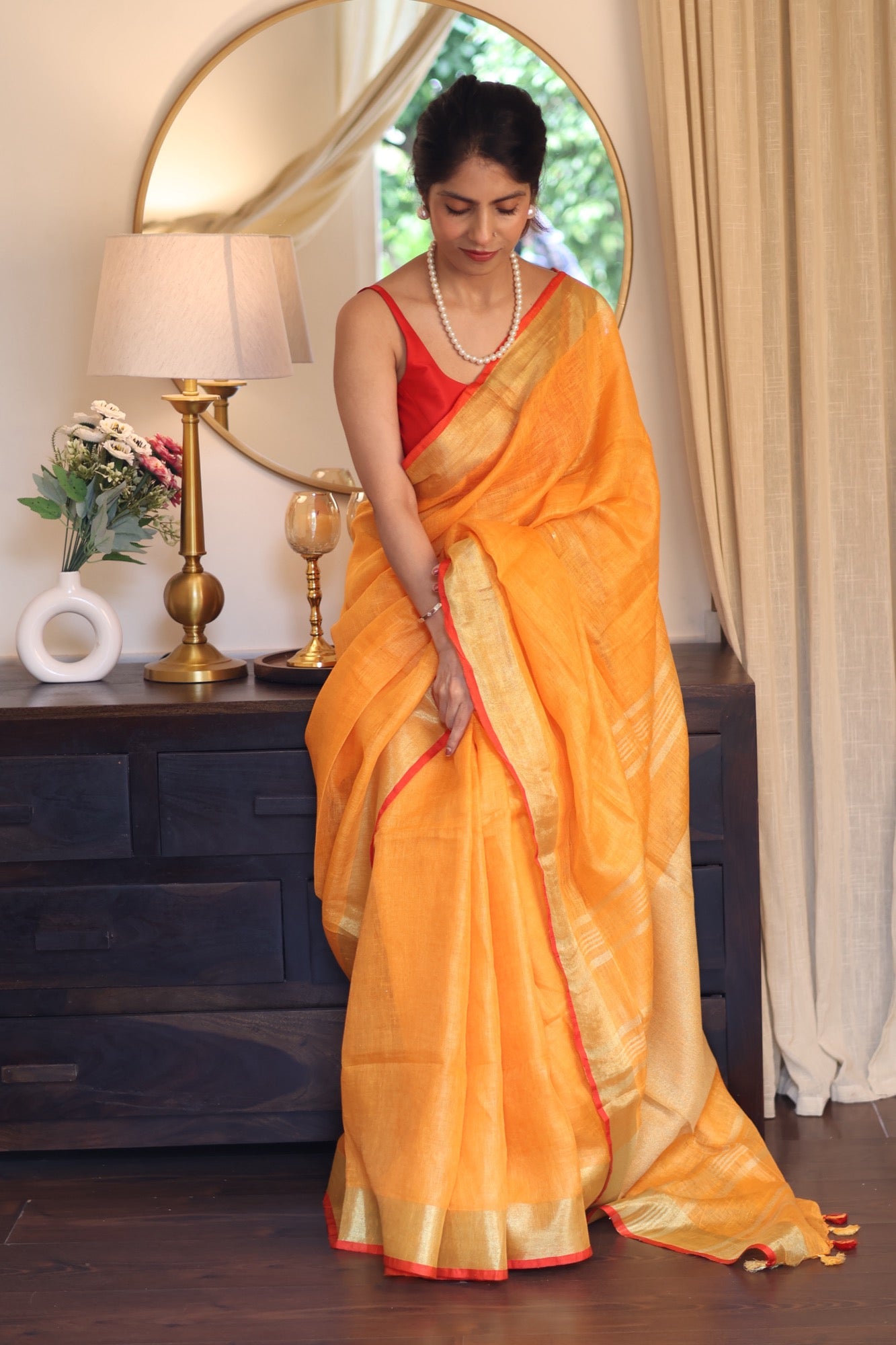 The vibrant amber-orange base, soft zari stripes, and playful tassels along the border create an effortless radiance. Whether it’s a morning celebration, a bright workday or a brunch date, this saree will light up your day with its bright, happy spirit.