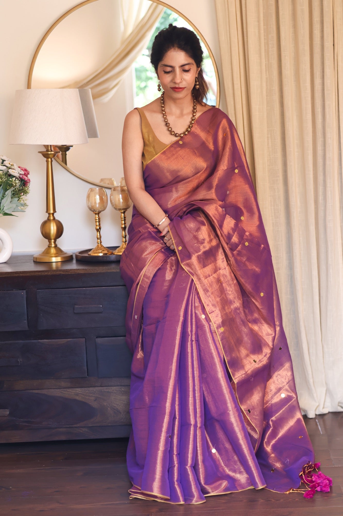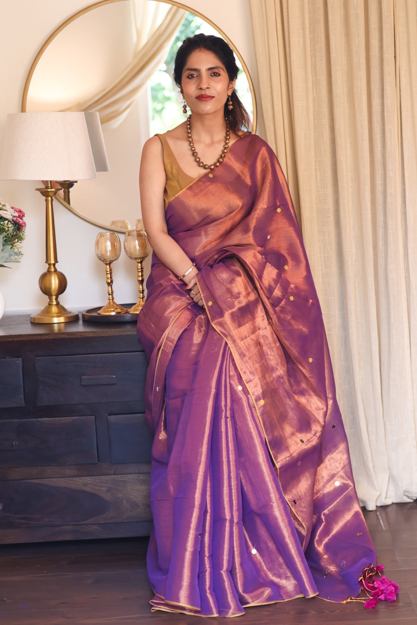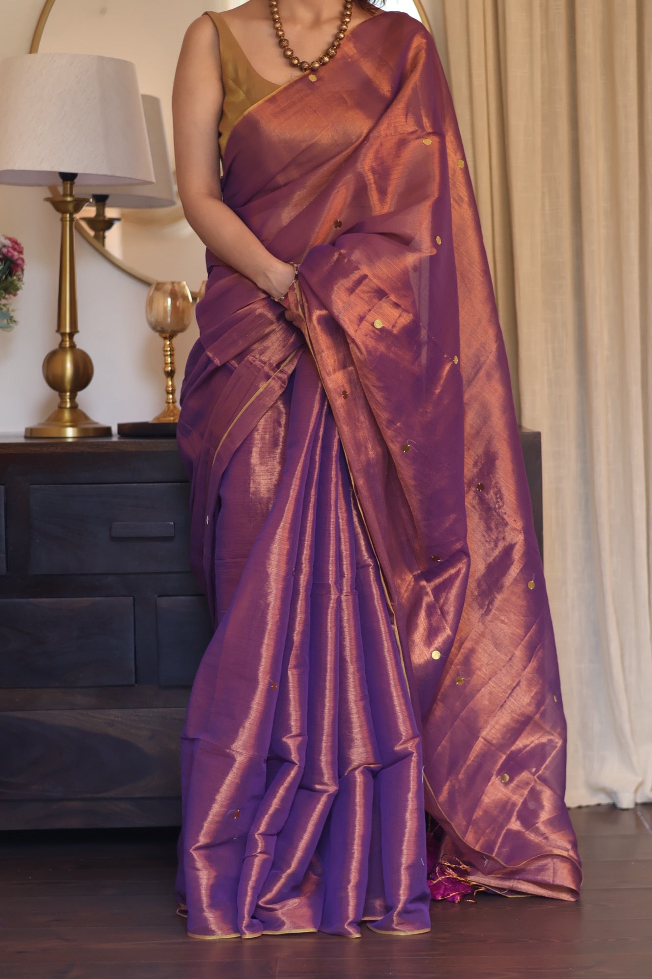 Bathed in royal purple with golden light woven through its folds, Suroor feels like a soft intoxication rich, regal, and effortlessly fluid. Its metallic sheen glows with quiet grandeur, making it the perfect drape for evenings that call for grace with a touch of allure.