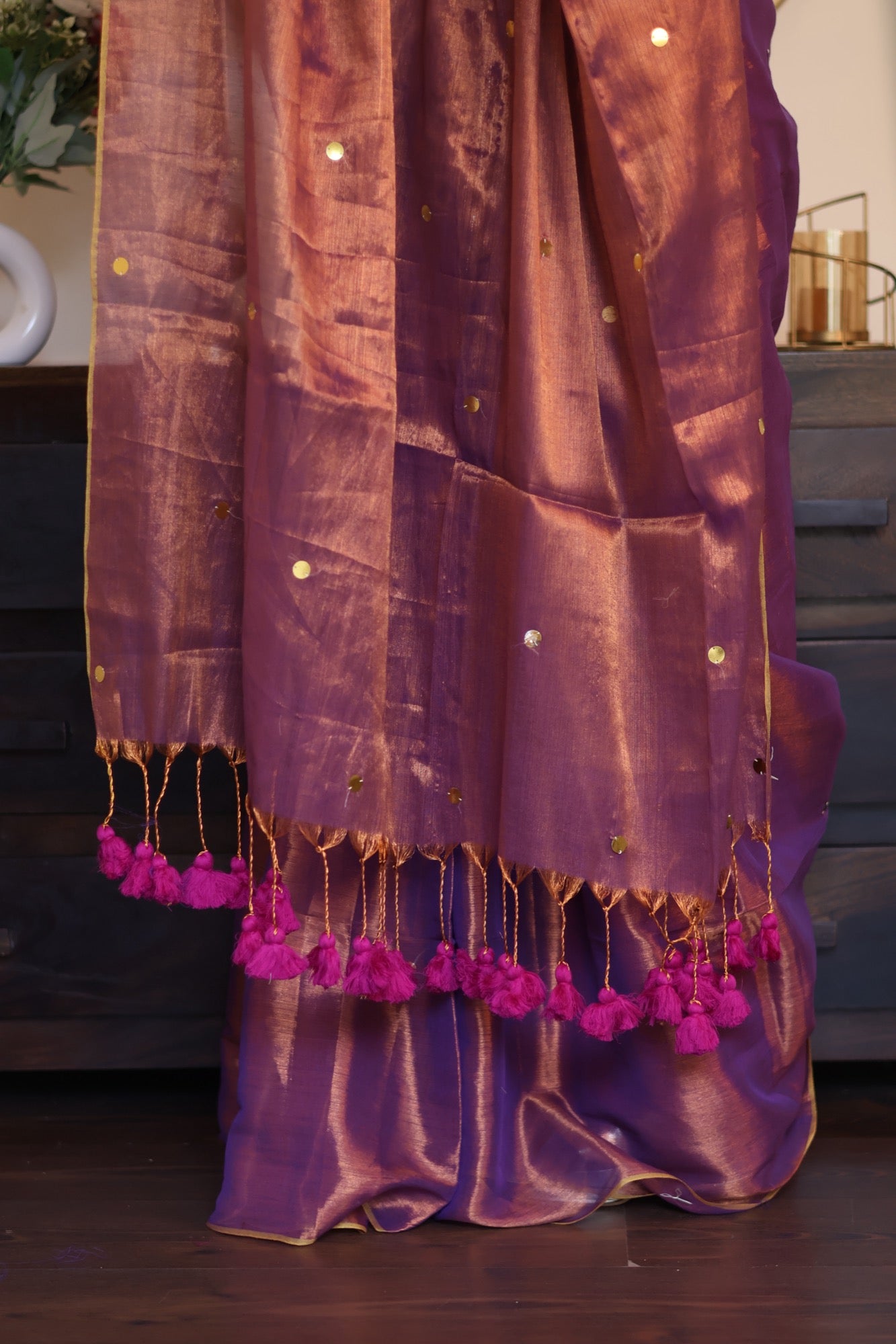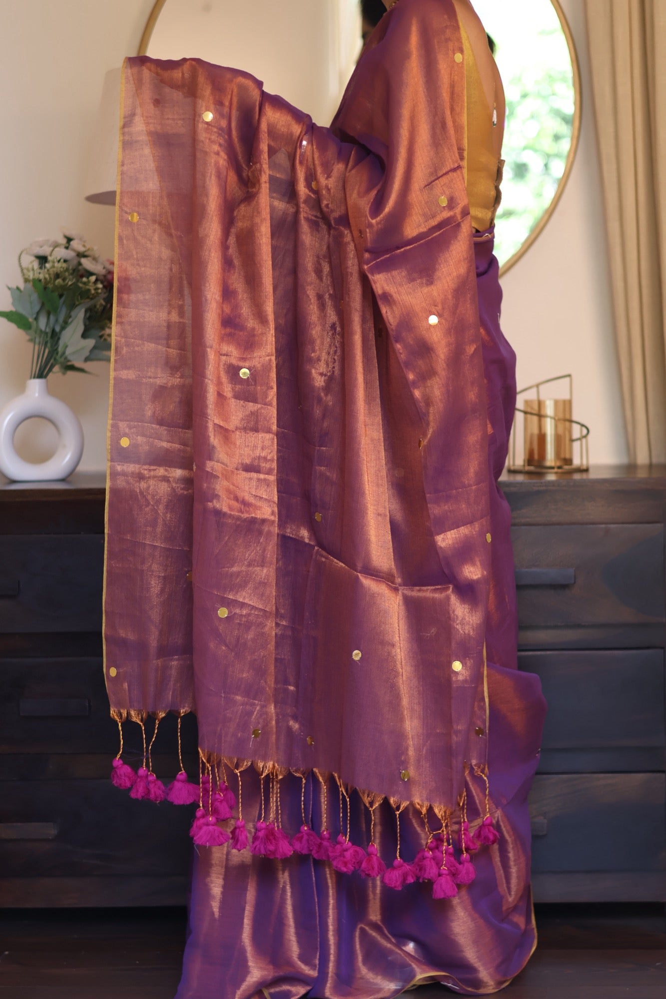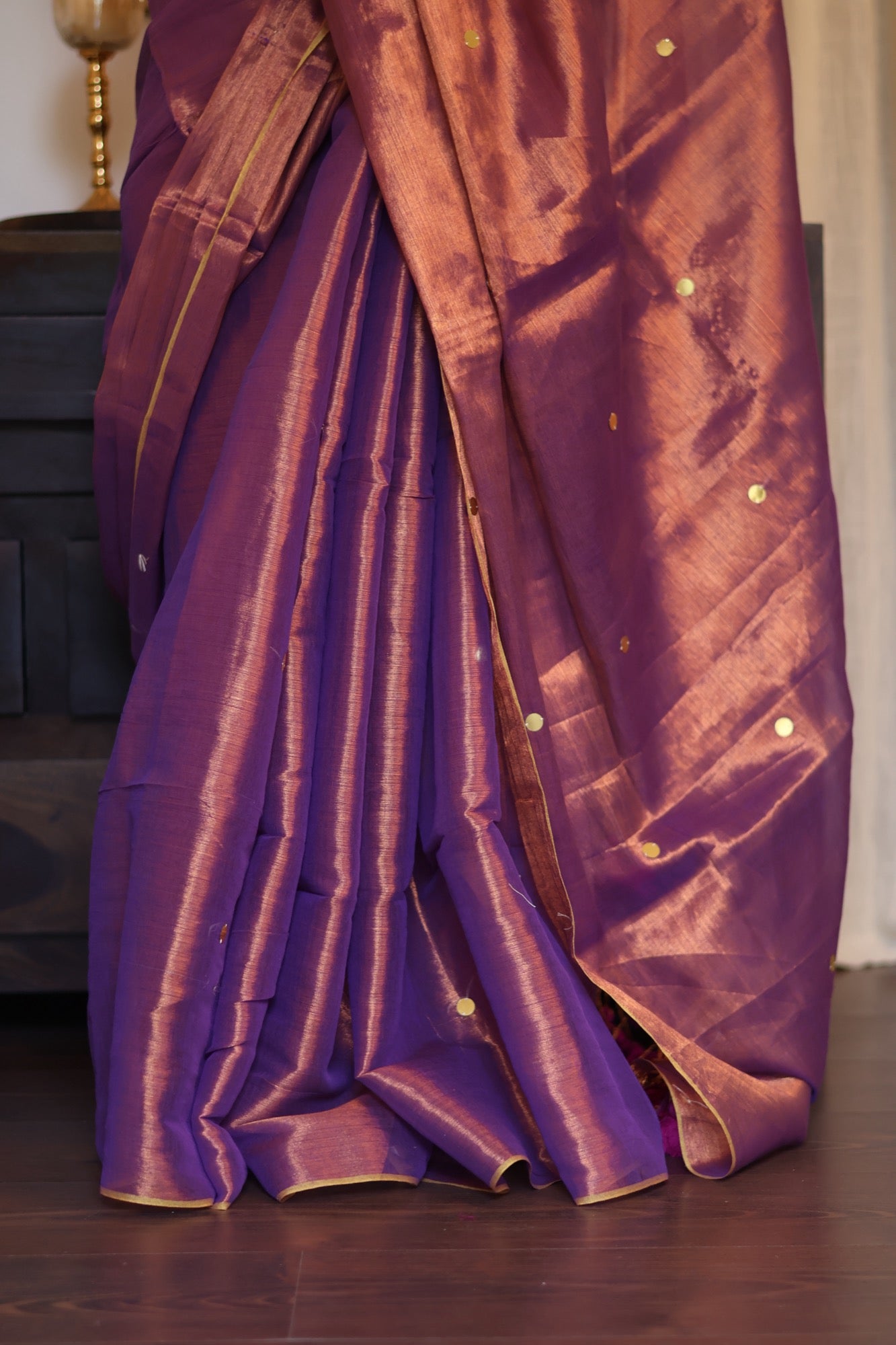 Bathed in royal purple with golden light woven through its folds, Suroor feels like a soft intoxication rich, regal, and effortlessly fluid. Its metallic sheen glows with quiet grandeur, making it the perfect drape for evenings that call for grace with a touch of allure.