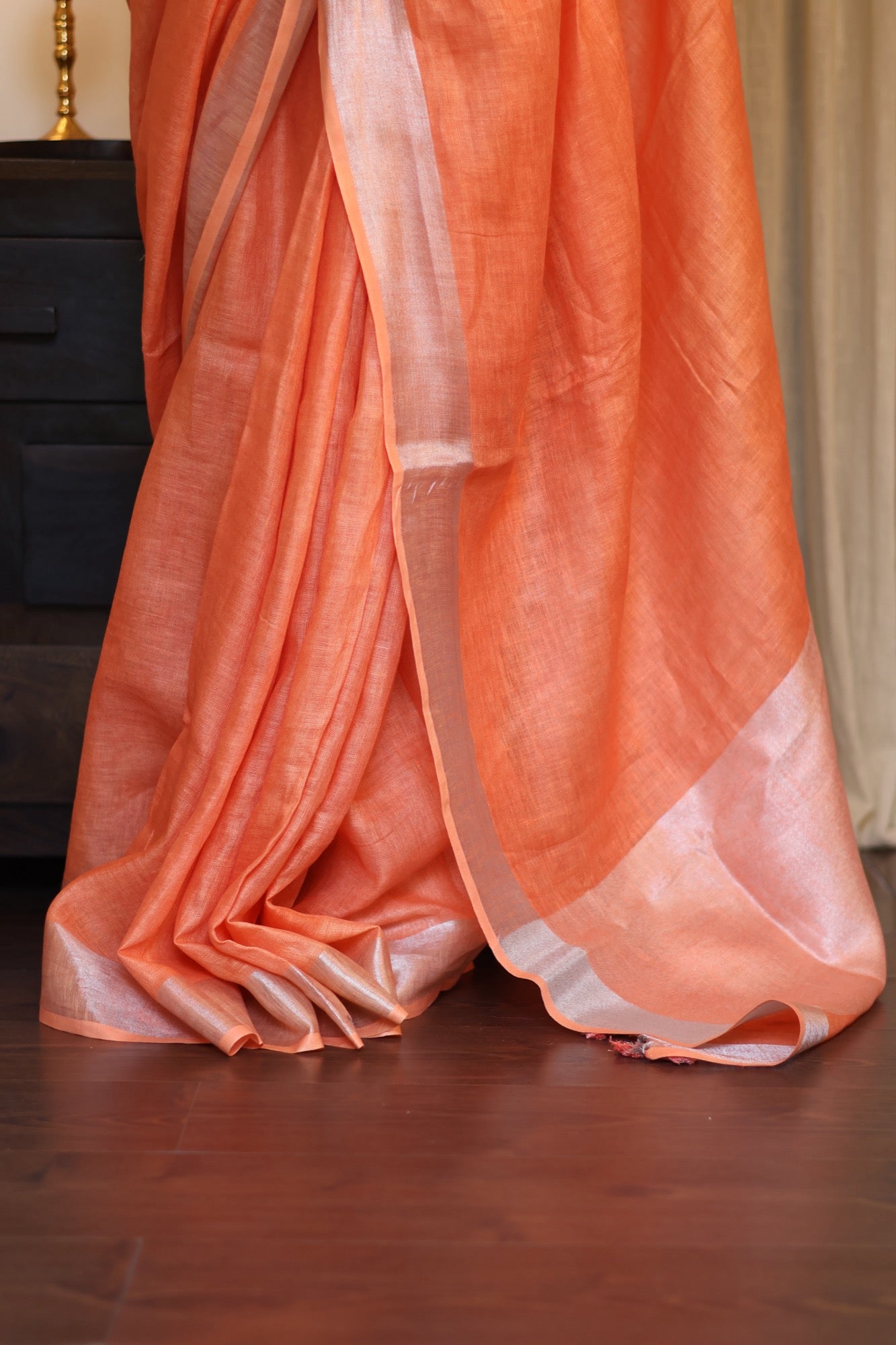There's something delightfully unexpected about a pop of citrus in a neutral world—bold, bright, and unmissable. Twist captures that same zest with its punchy orange tone and subtle sheen. The soft handloom linen drapes like a dream, while delicate tassels add a playful edge.