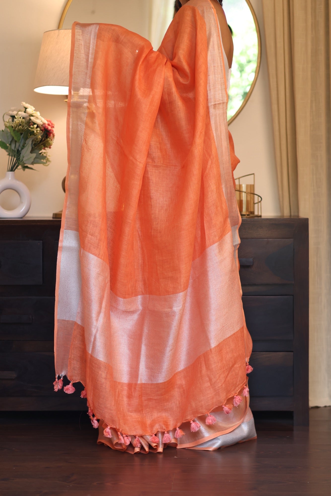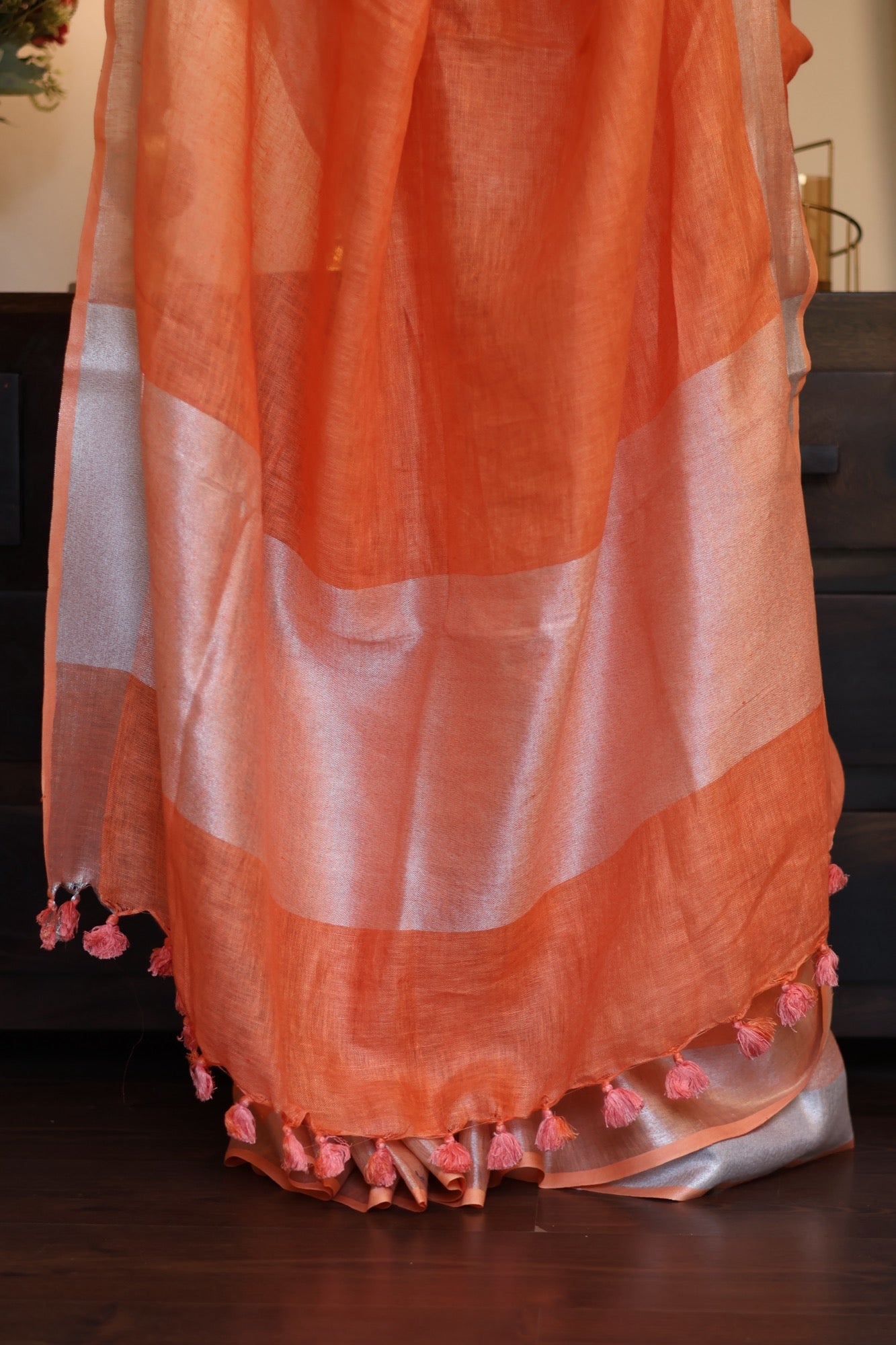 Colour: Warm tangerine orange with zari border and pink-orange tassels