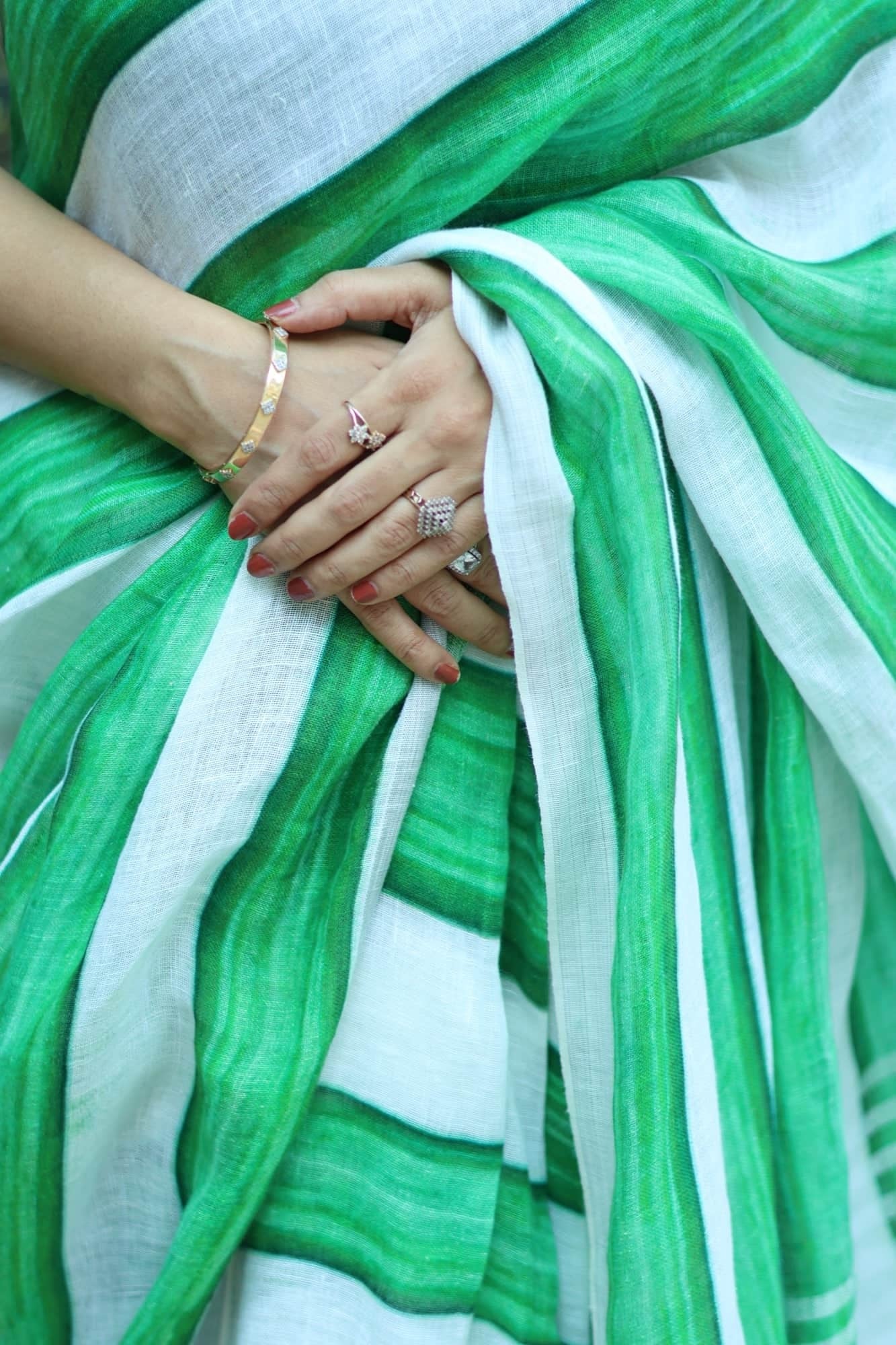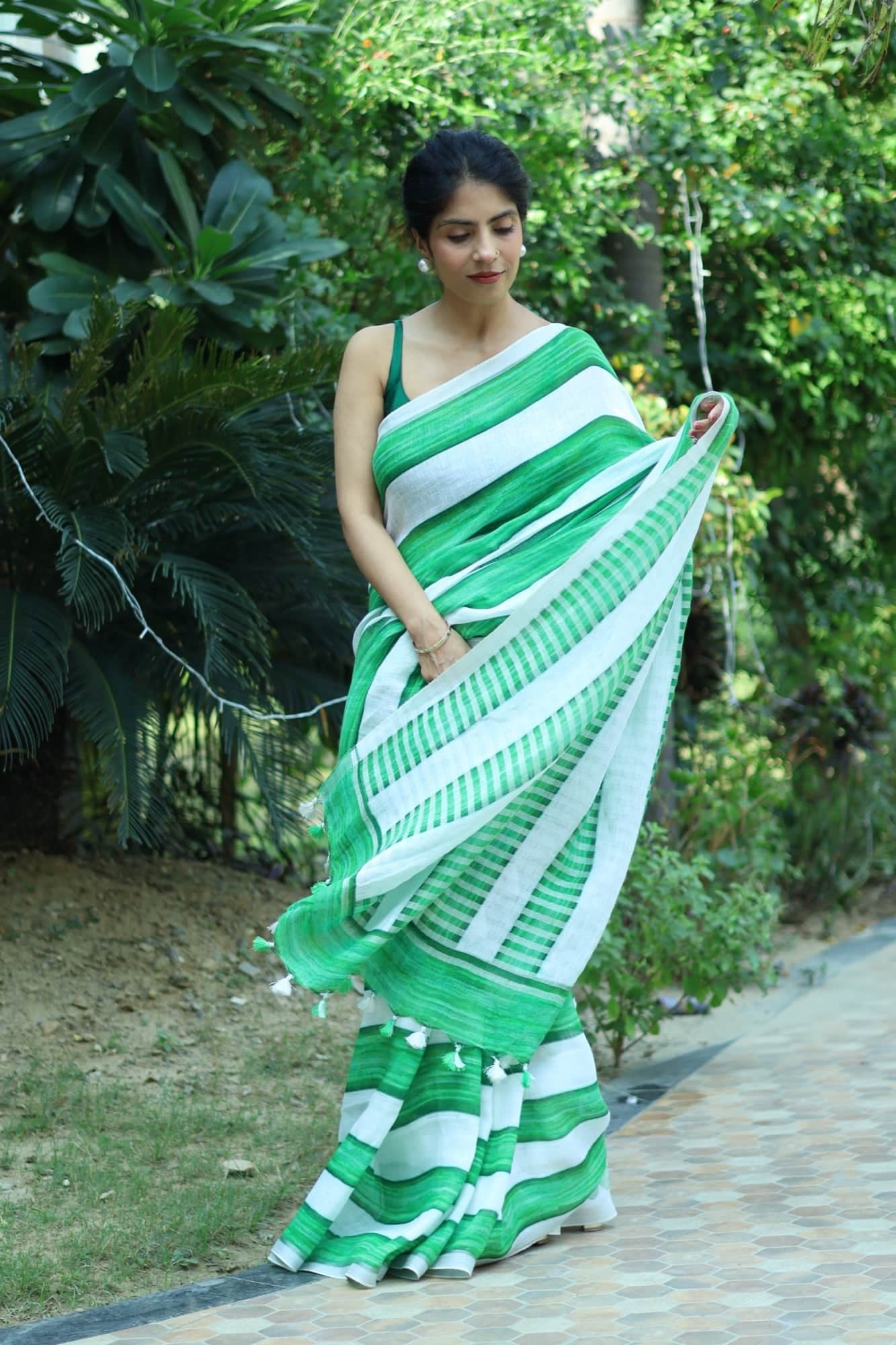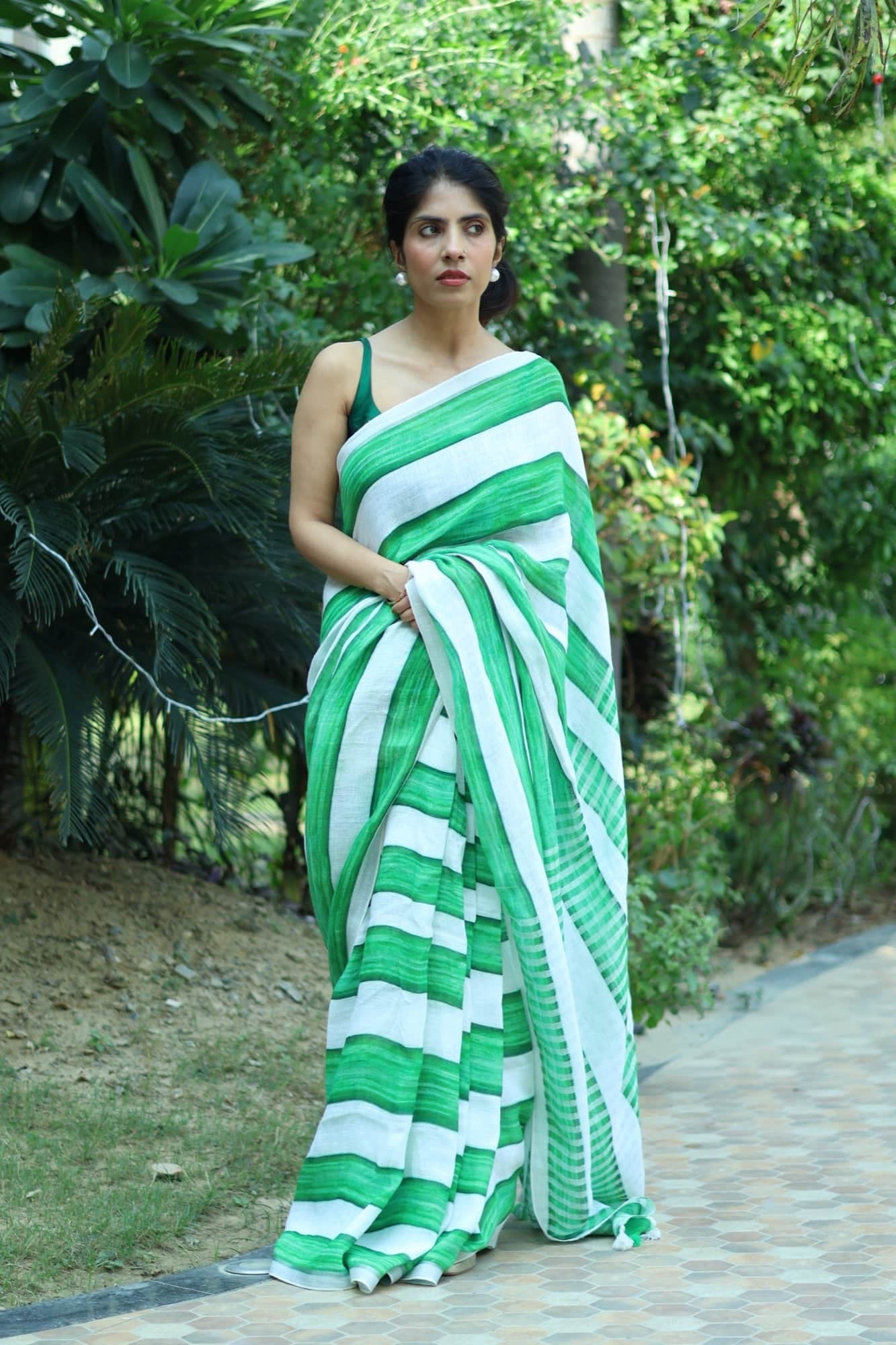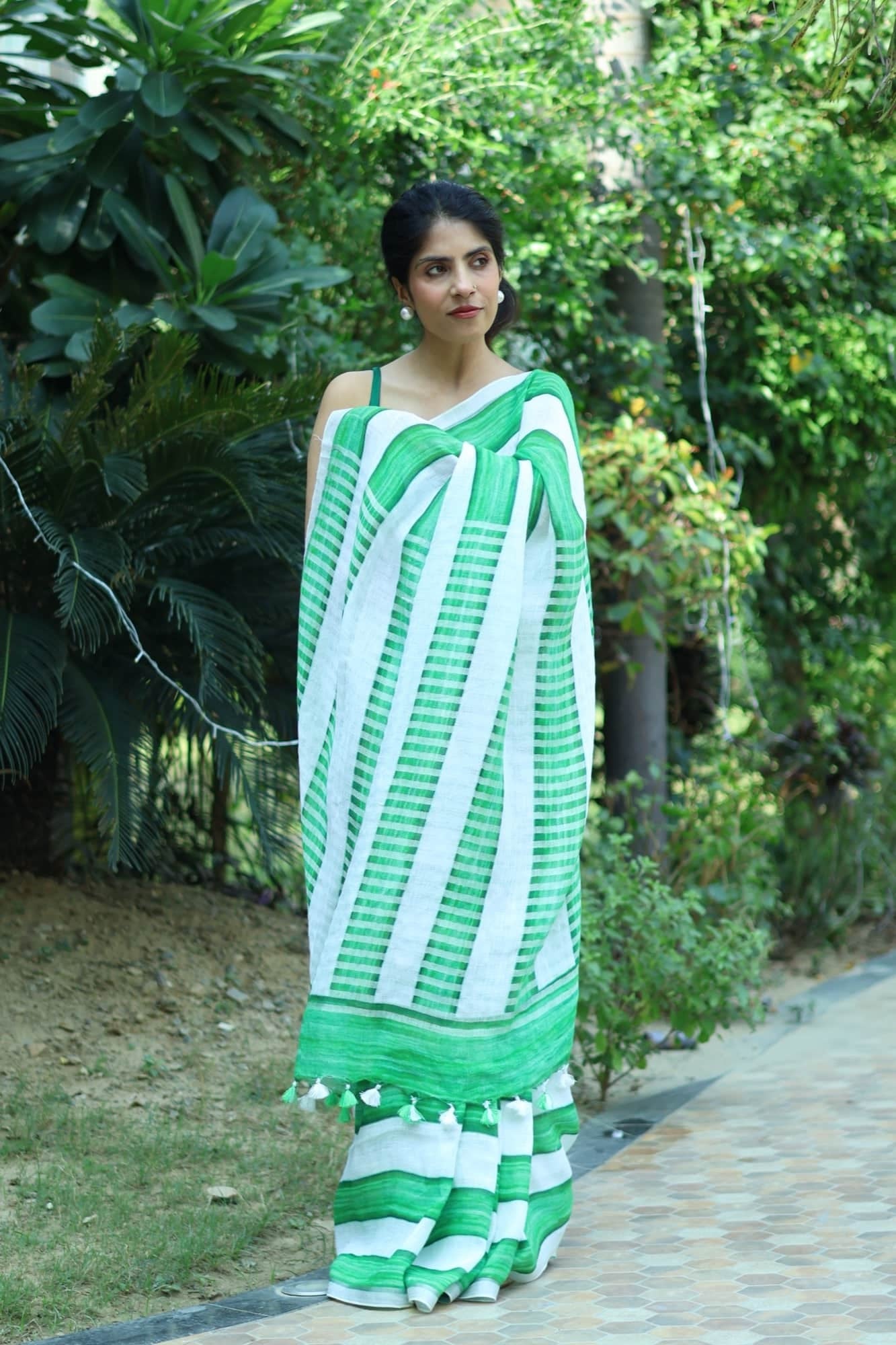 Striking yet serene, Verdure brings a fresh wave of confidence with its brushstroke stripes in lush green against ivory white. Digitally printed on pure linen, it blends painterly charm with everyday elegance. The checked pallu and dual-toned tassels add a soft playfulness, making this saree an effortless statement for slow mornings, summer brunches, or conscious celebrations.