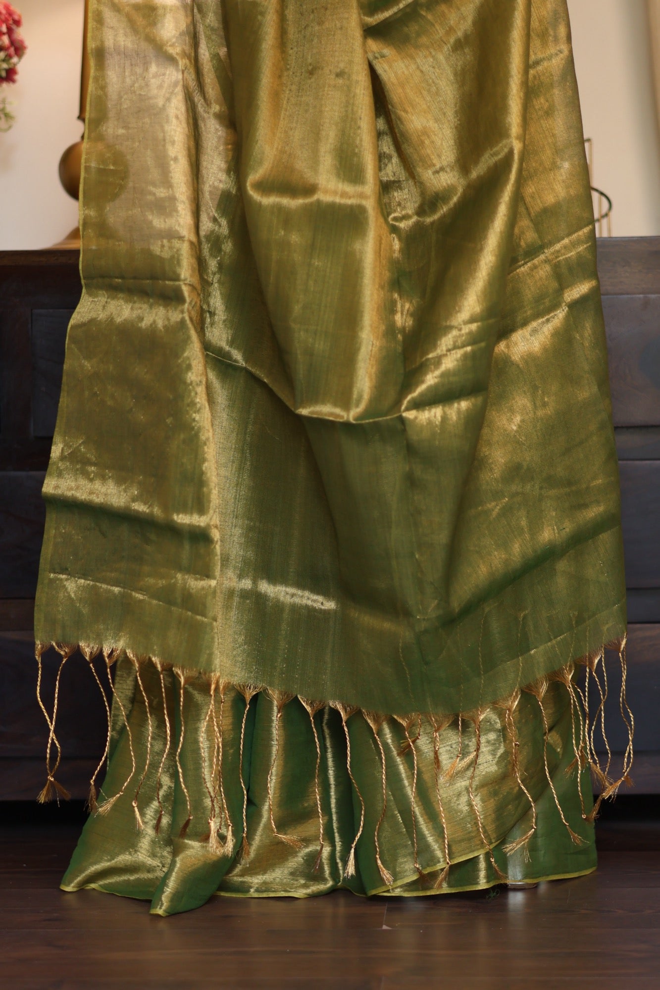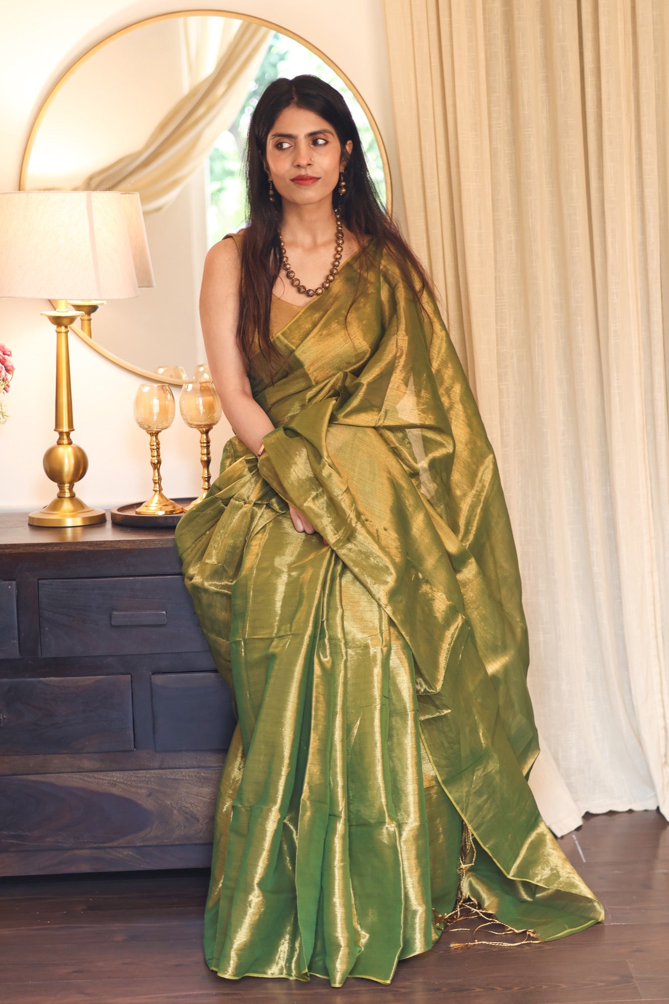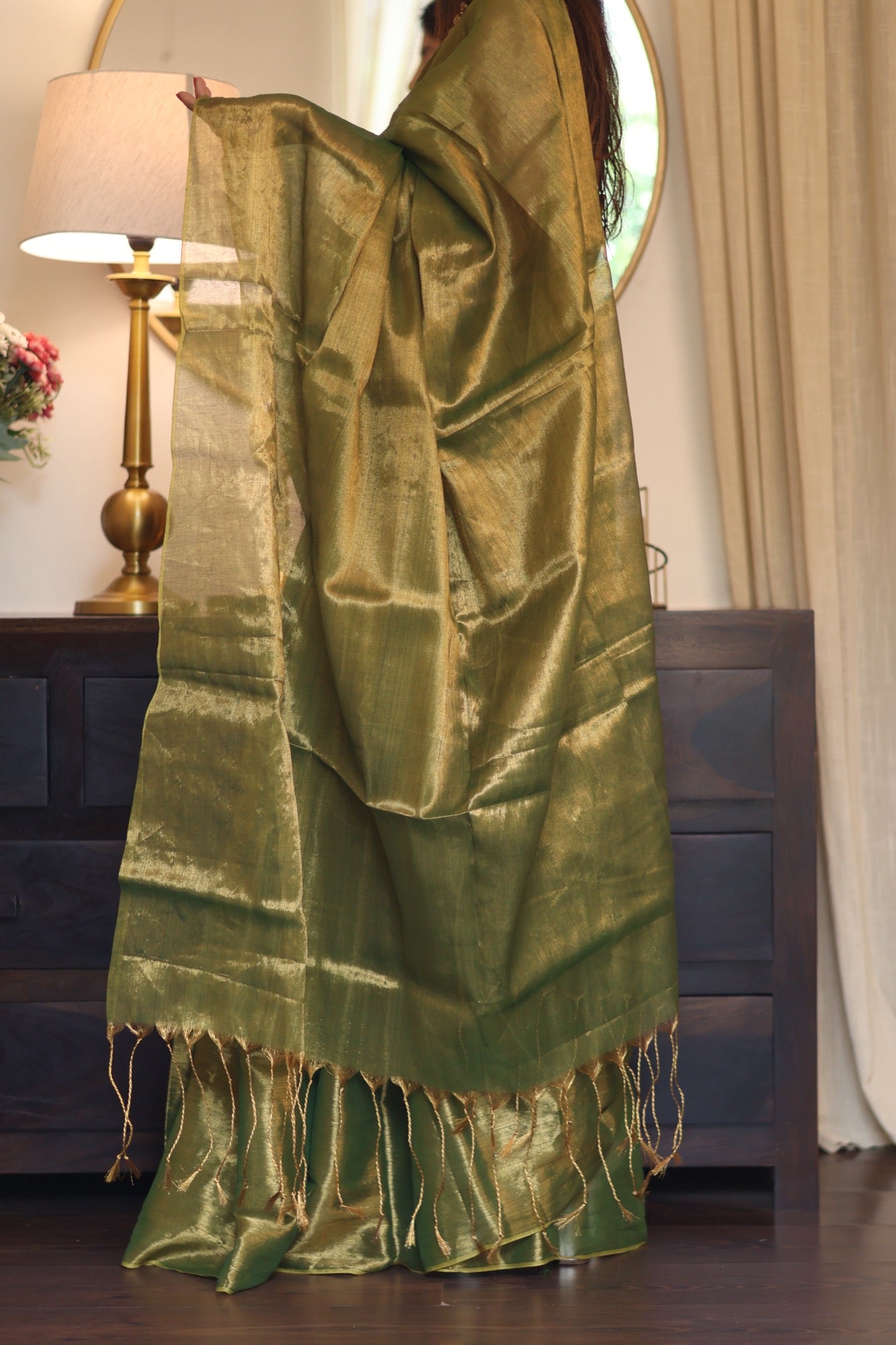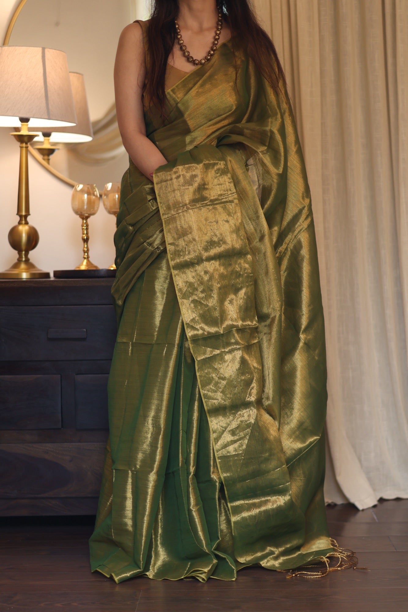 Elegant, powerful, and timeless Zaitoon is a metallic tissue saree that blends earthy olive tones with a molten gold sheen. Its fluid drape and subtle shimmer make it a statement of quiet luxury, perfect for festive soirées, weddings, or evenings when you want to shine with understated grace.